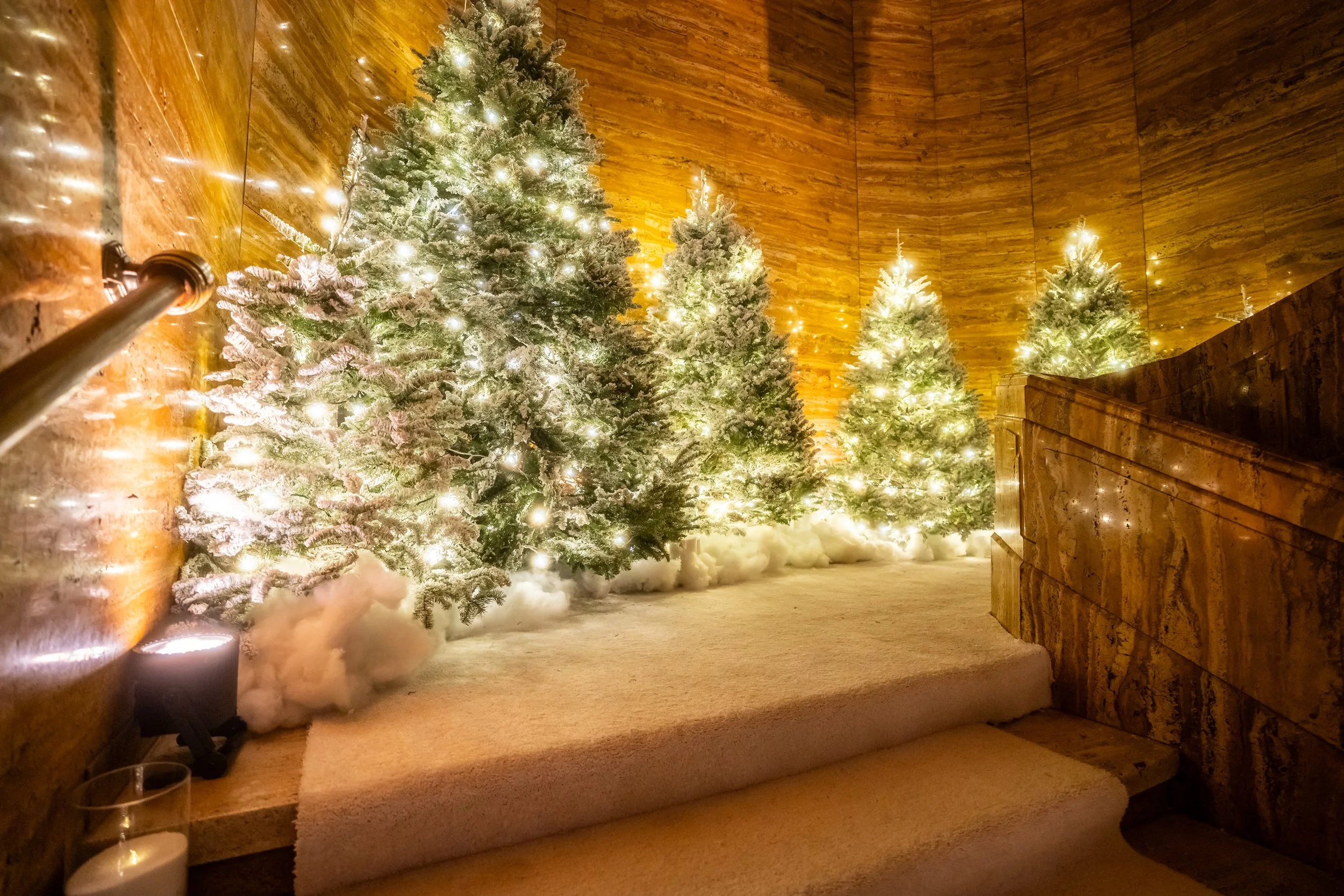 For residential clients, frosted branches, crystal ornaments, and soft lighting create a serene, monochromatic look. In corporate spaces — especially luxury retail, high-end galleries, and modern office lobbies — this palette conveys refinement and purity. White and silver offer visual stillness amidst the holiday rush — ideal for those who prefer simplicity that still feels spectacular.