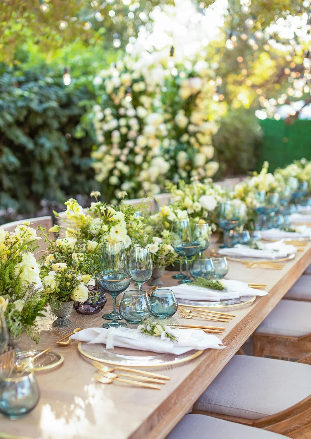 For weddings, light blue and green florals paired with white help guide the eye naturally throughout the event. From ceremony arrangements to reception details, these colors maintain continuity while allowing each design moment to feel distinct.
