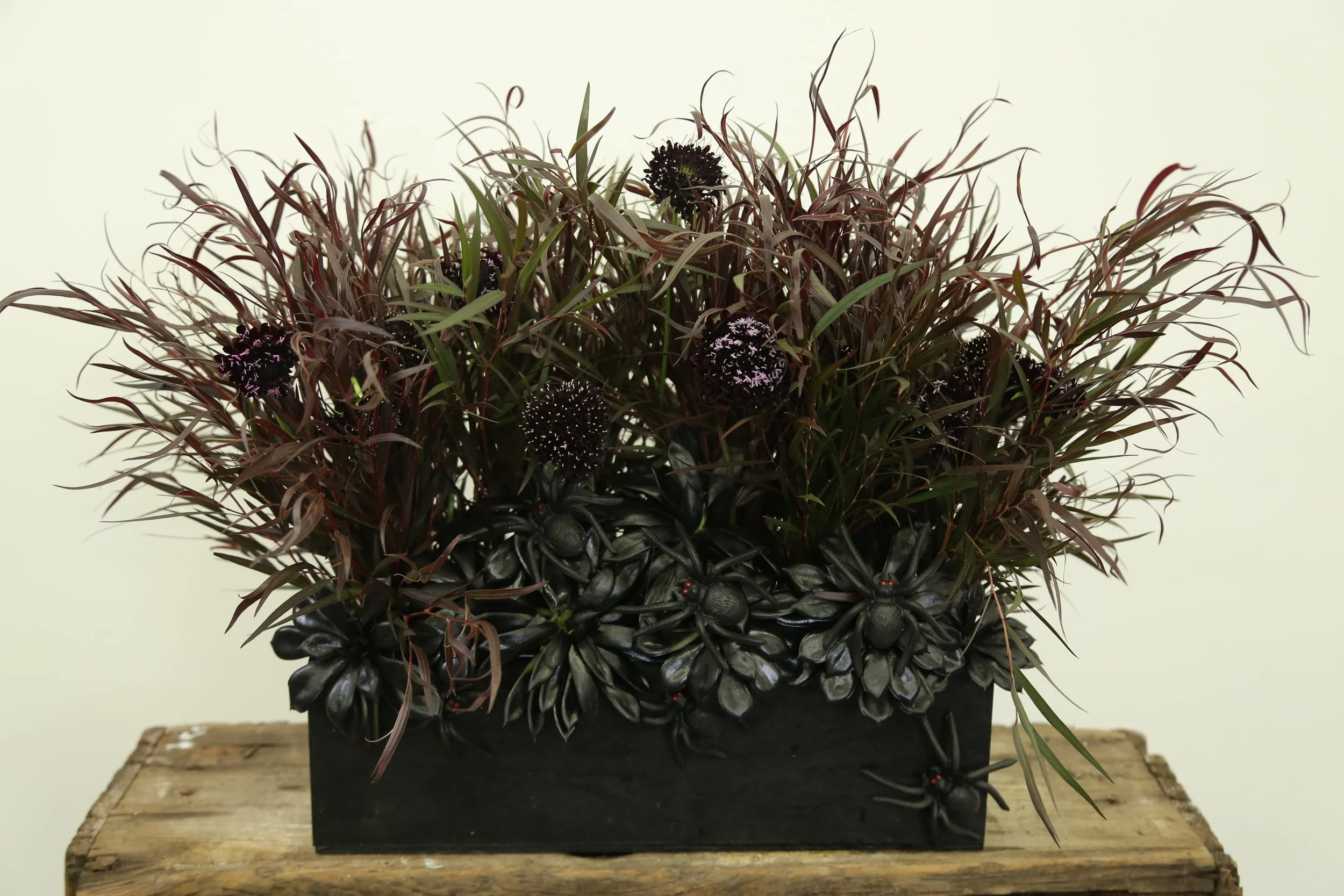 One of our very favorite floral arrangements during the Halloween season - the Black Widow Floral Arrangement! Succulents, flowers and grasses in deep, dark colors are the perfect Halloween inspiration.