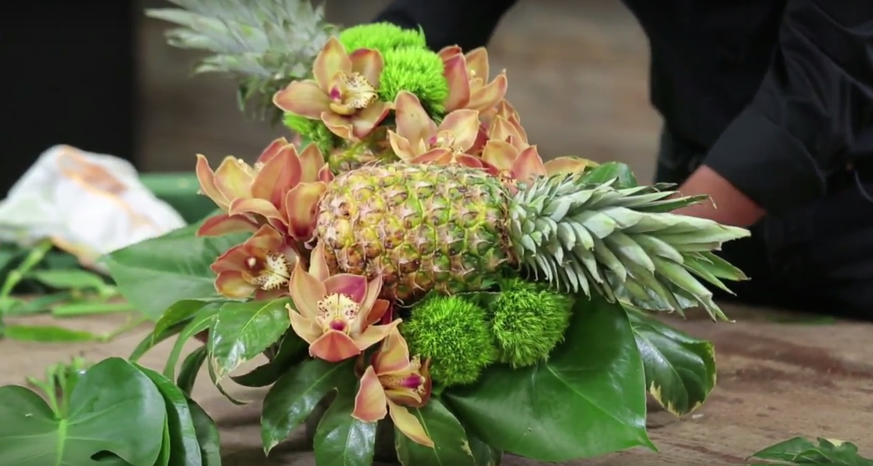 A tropical Pineapple Floral Arrangement designed and demonstrated by Eddie Zaratsian - watch the video to learn how you can make it too!
